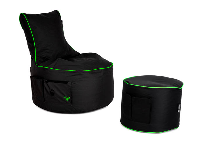 Für mehr Komfort ist unser Sitzsack Maverick Sessel zusätzlich mit einem Fußhocker in Kombination erhältlich. Dieser hat ebenfalls Seitentaschen für Spielzubehör!