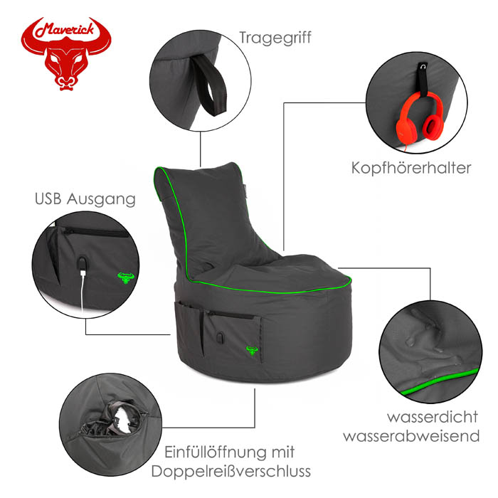 Der hochwertige wasser- und schmutzabweisende Maverick Gaming Sitzsack Set ist bestens geeignet für drinnen und draußen. Unsere Sitzsäcke sprechen alle Altersgruppen an. Viele Gamer Lounge, Kindergärten, Schulen, Events oder auch Gastronomie Bereiche statten sich mit unseren hochwertigen Sitzsäcken aus. Sie müssen den Sitzsack nur noch aus dem Karton auspacken und können ihn benutzen.